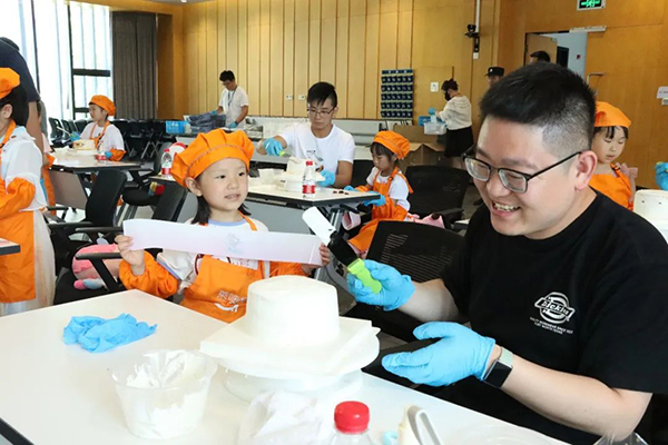 小朋友們稍作休息之后就進(jìn)入了今天的重頭戲——親子DIY蛋糕。大家穿上圍裙,戴上廚師帽,化身小小烘焙師,跟隨著專業(yè)的蛋糕老師,從放蛋糕坯、擠奶油,再到抹面、裝飾。大家都聚精會(huì)神,認(rèn)真聽(tīng)著老師講解,有條不紊地進(jìn)行制作,最終一個(gè)個(gè)精美的卡通蛋糕在一雙雙巧手中誕生,小朋友們迫不及待地與自己的作品合影,記錄下這一成就感滿滿的時(shí)刻!